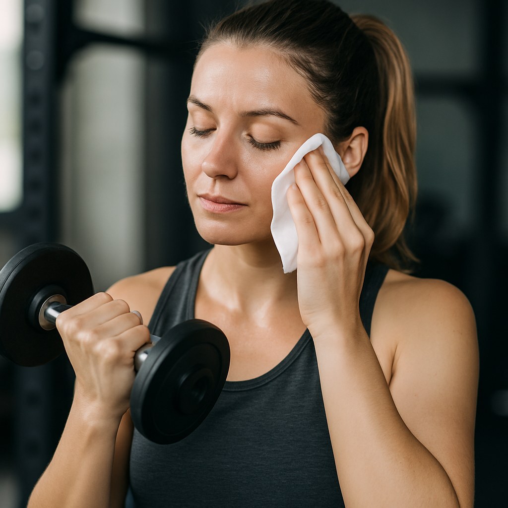 - Wipe it away – Gently clear sweat from key areas like face, hands, and underarms using a gentle wet wipe.