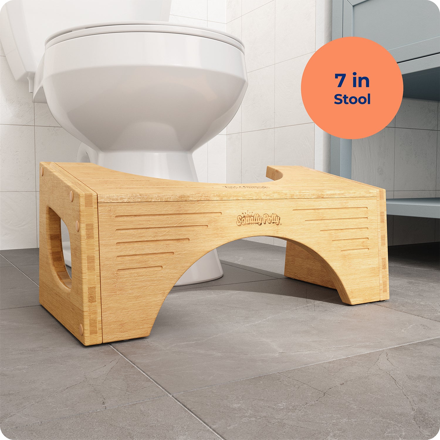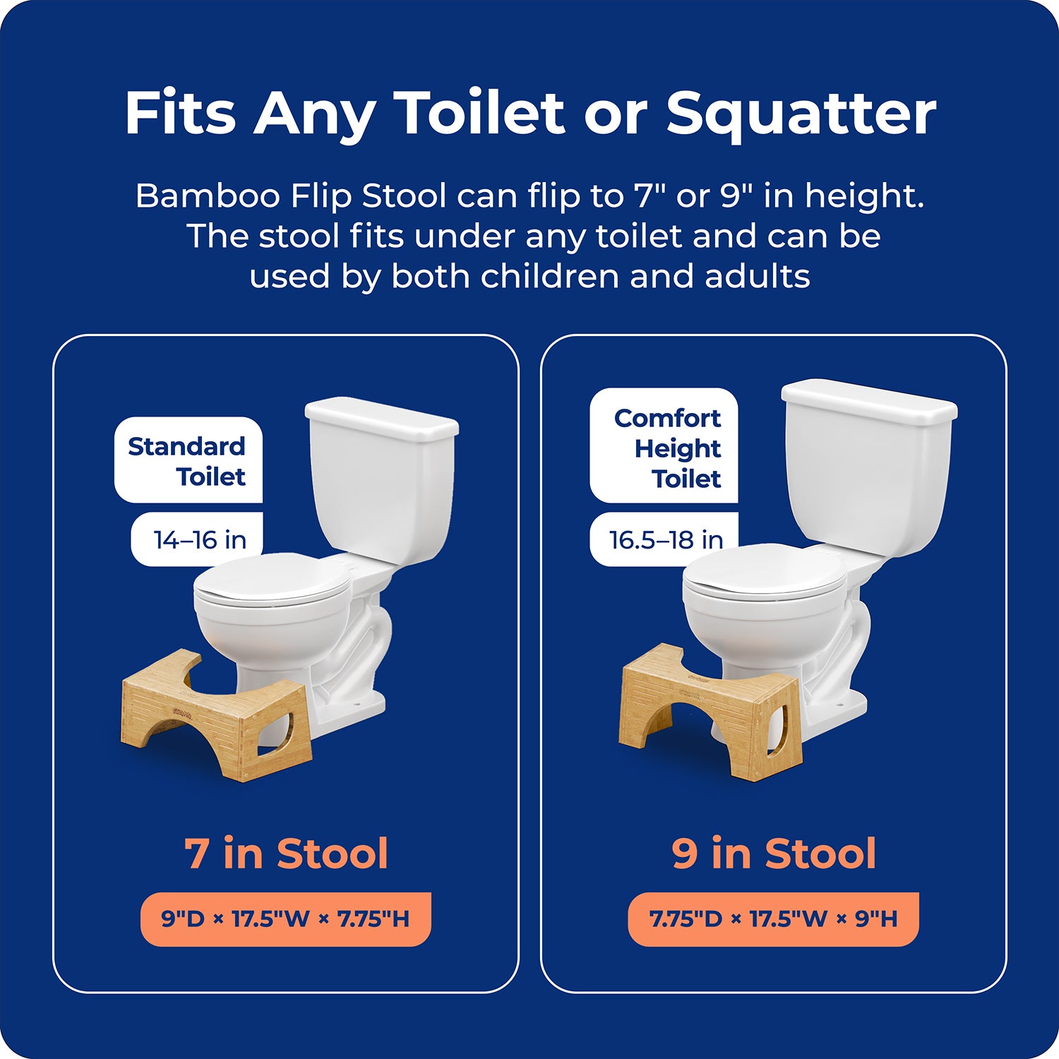 This versatile toilet stool can flip to 7” or 9” in height. Perfect for any toilet size.
